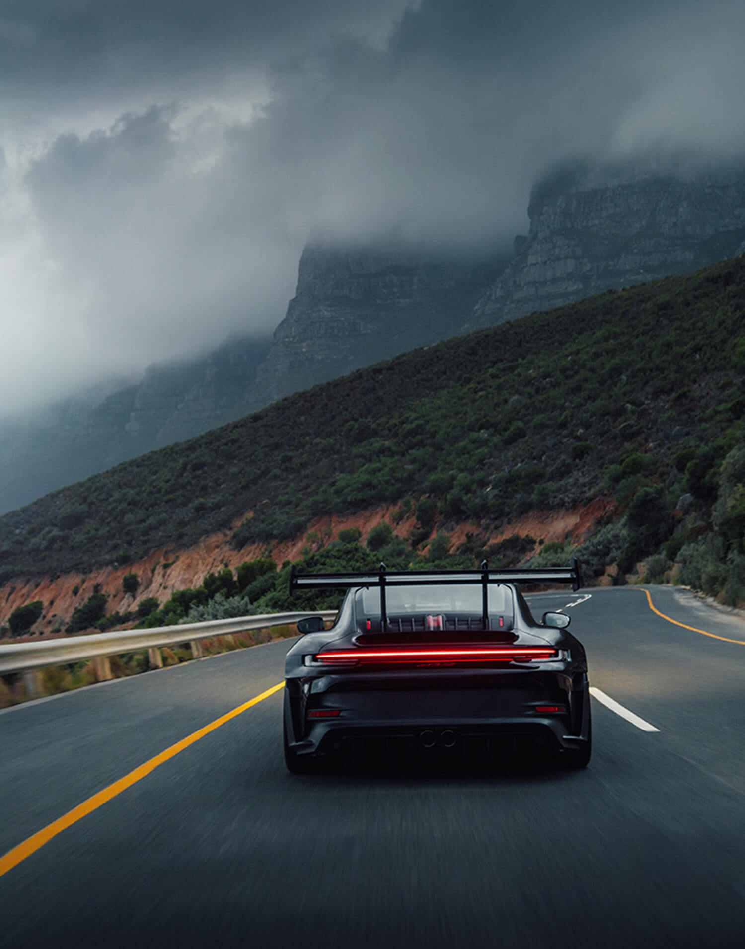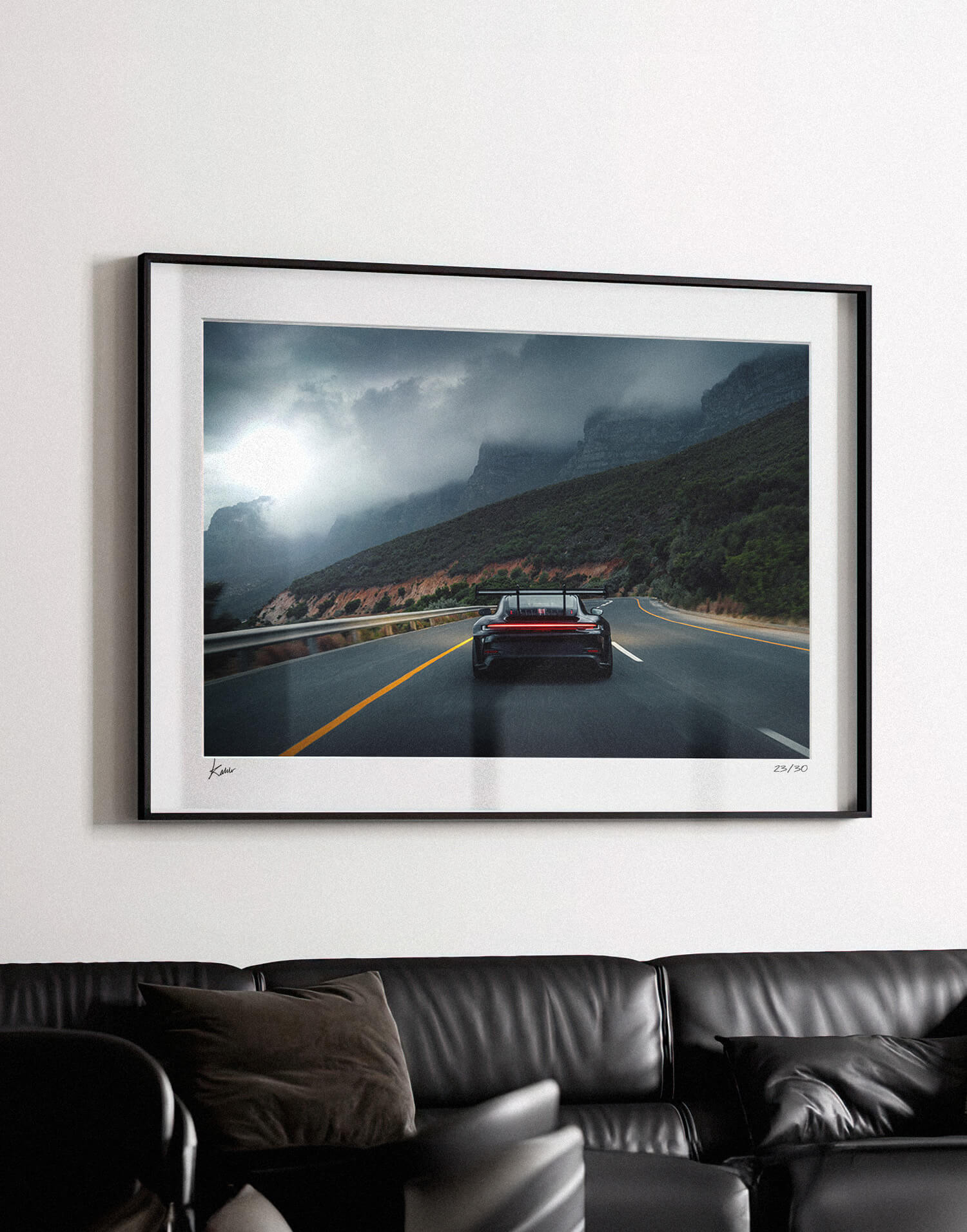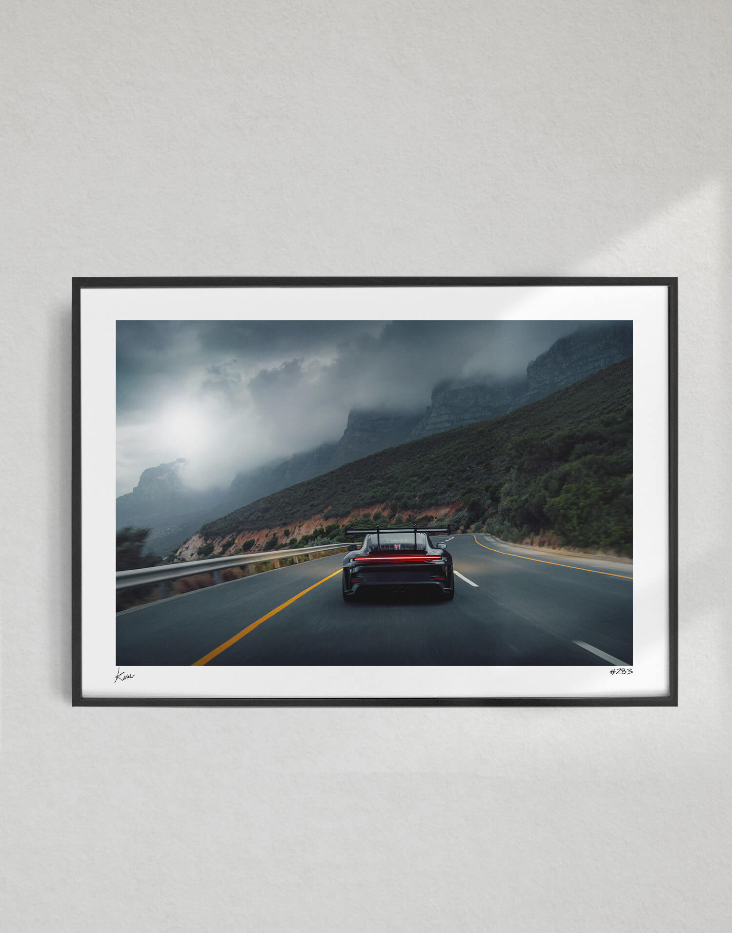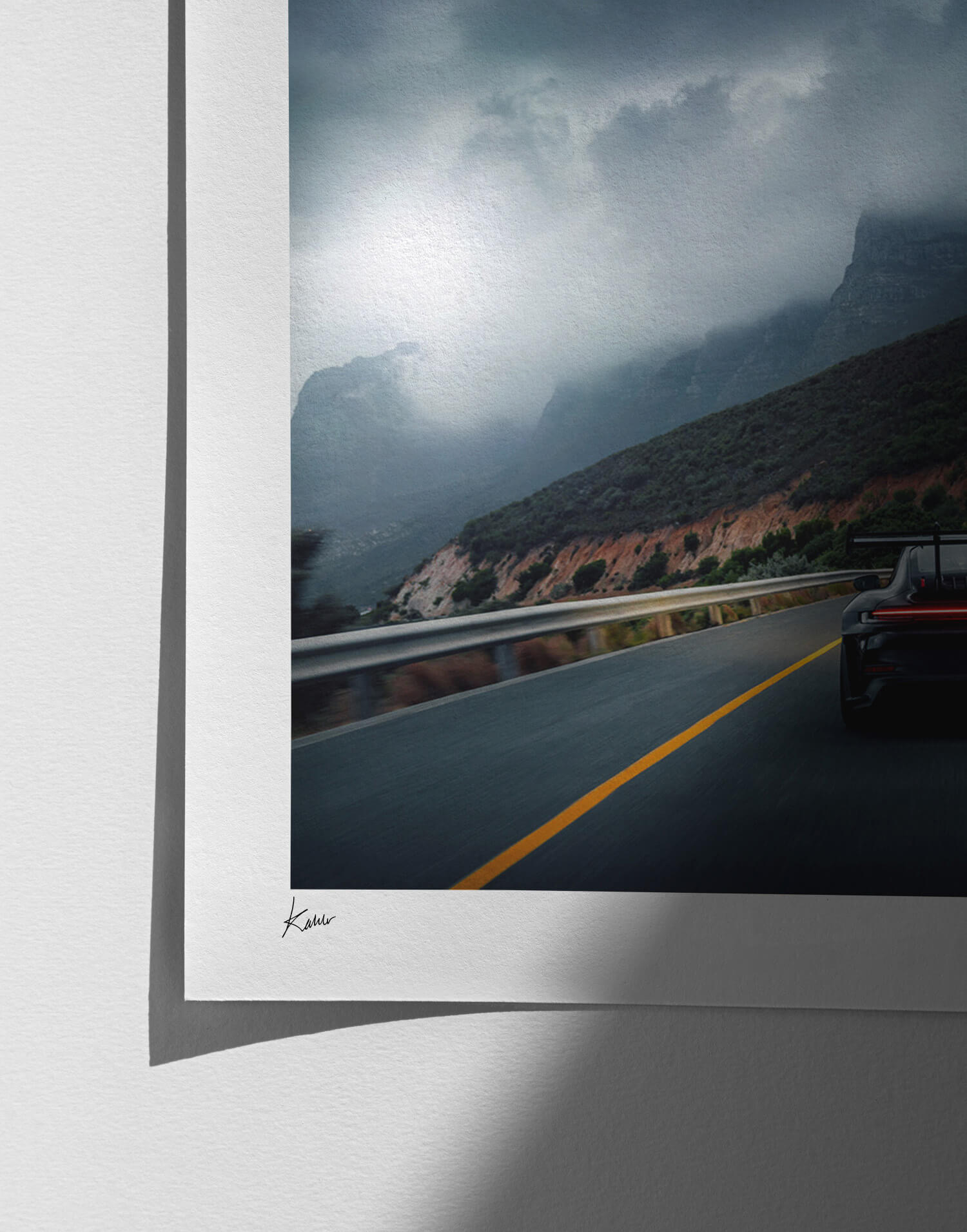 Tom Kahler’s incredible fine art photograph showcases the 2023 Porsche GT3RS gracefully navigating a twisting mountain road in South Africa. The supercar’s sleek lines stand out magnificently against the vibrant, rugged landscape and the dramatic, overcast sky, sparking an exhilarating sense of mystery and adventure in this enchanting scene.