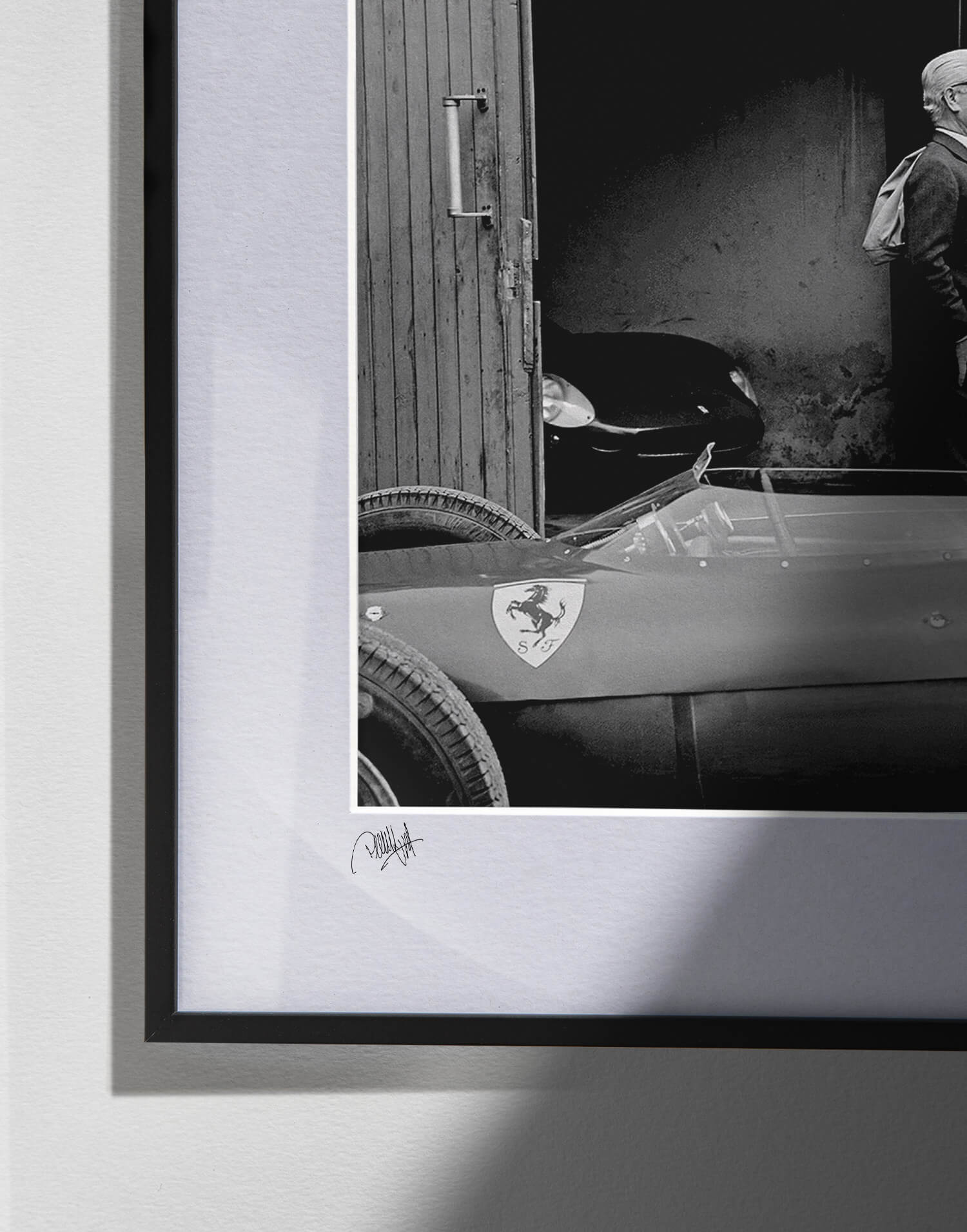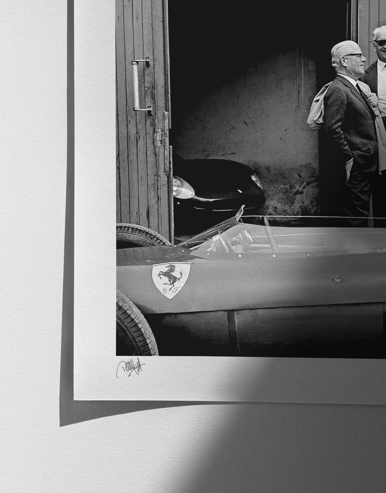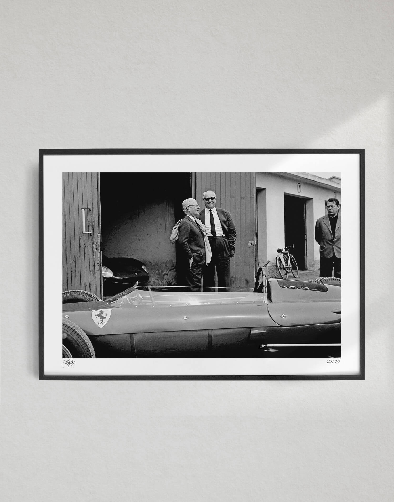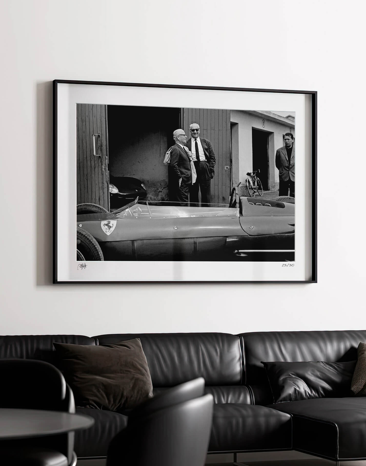 Enzo Ferrari and Battista Pinin Farina during F1 testing at Monza in 1964. Framed photography print, produced in limited edition by WheelsOnWalls Gallery.