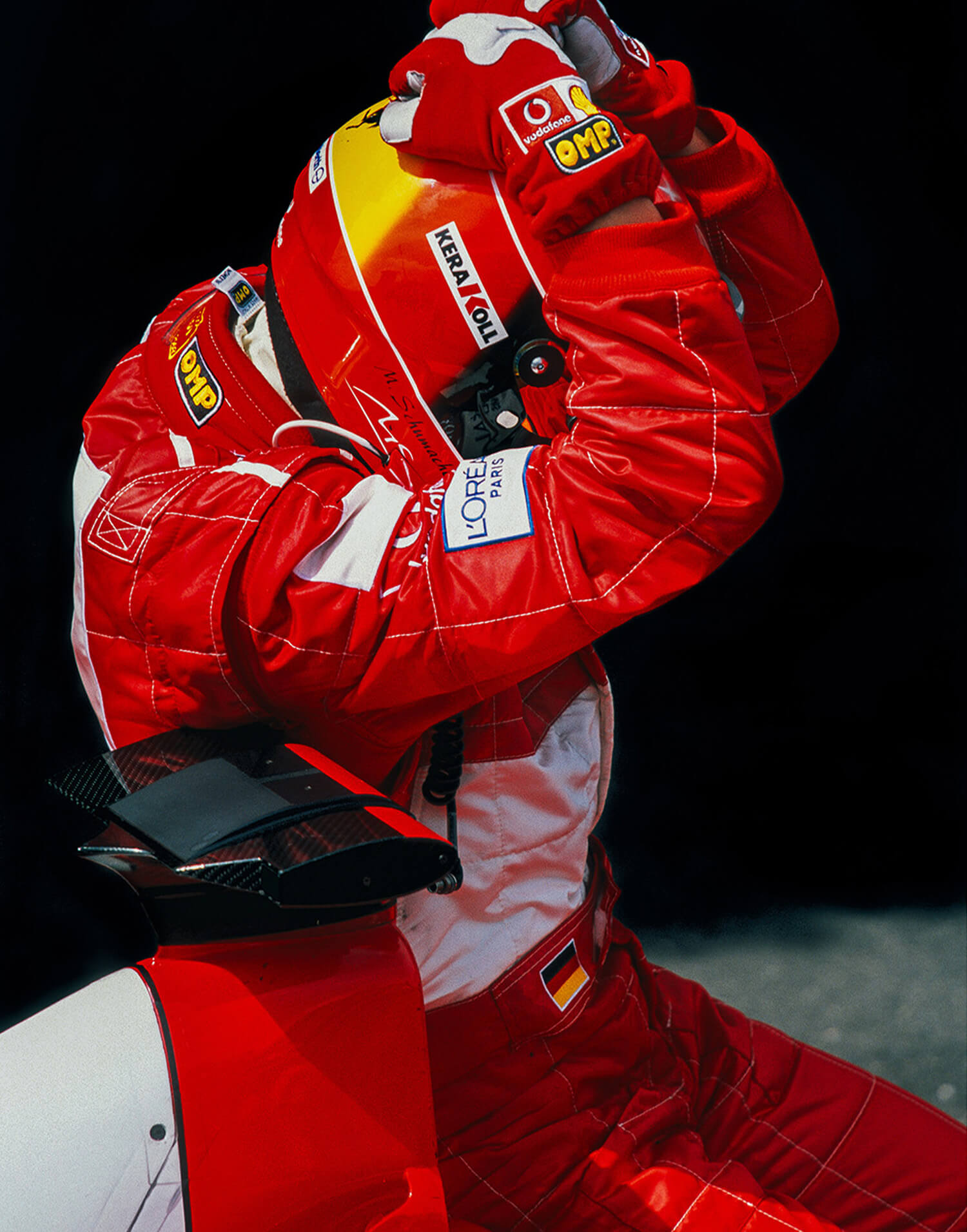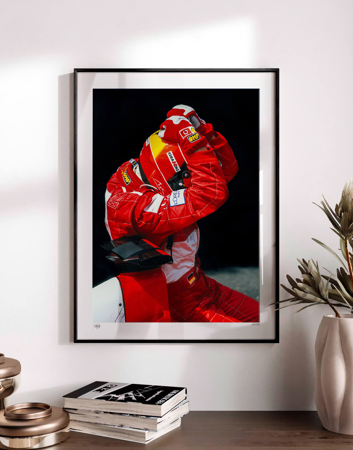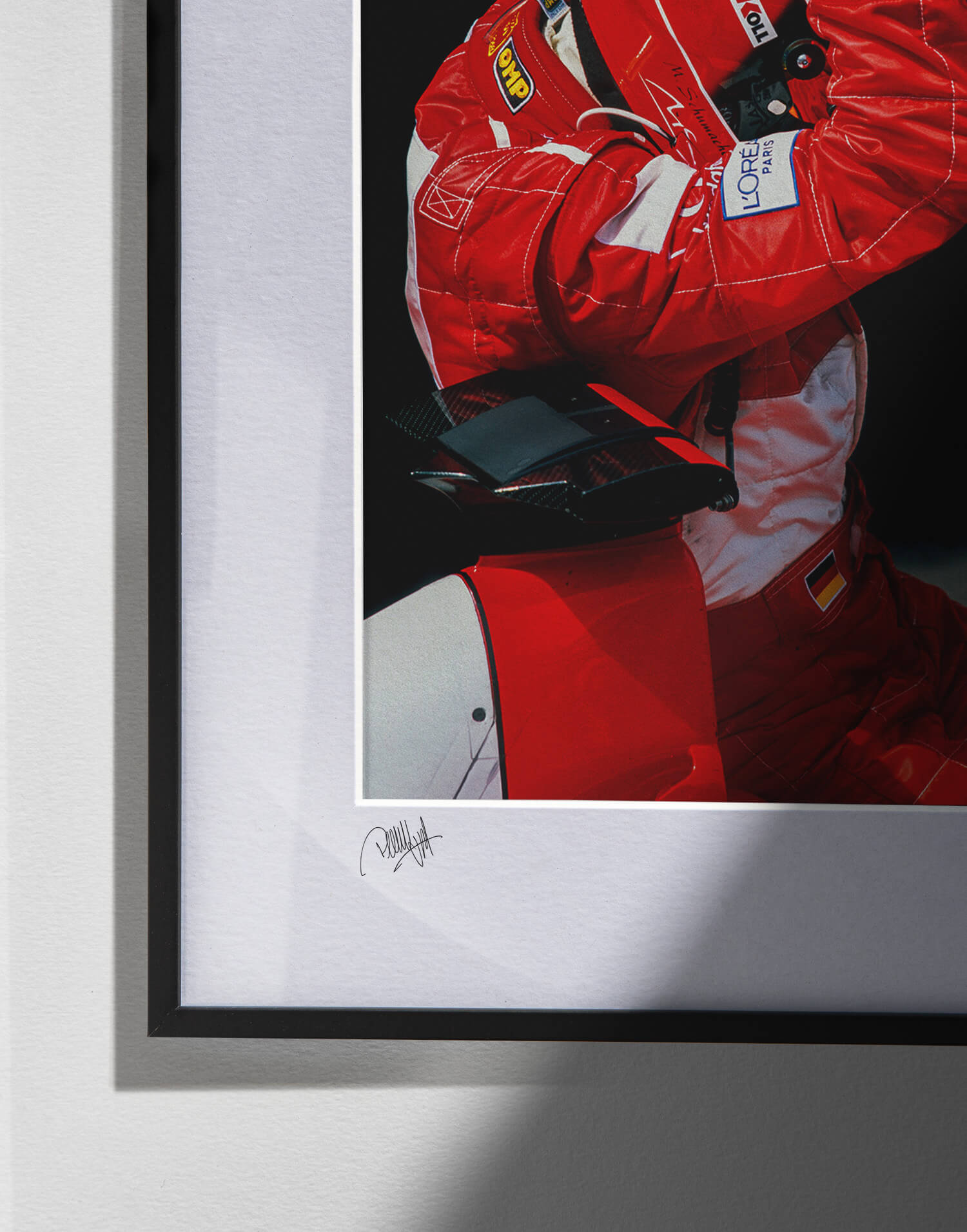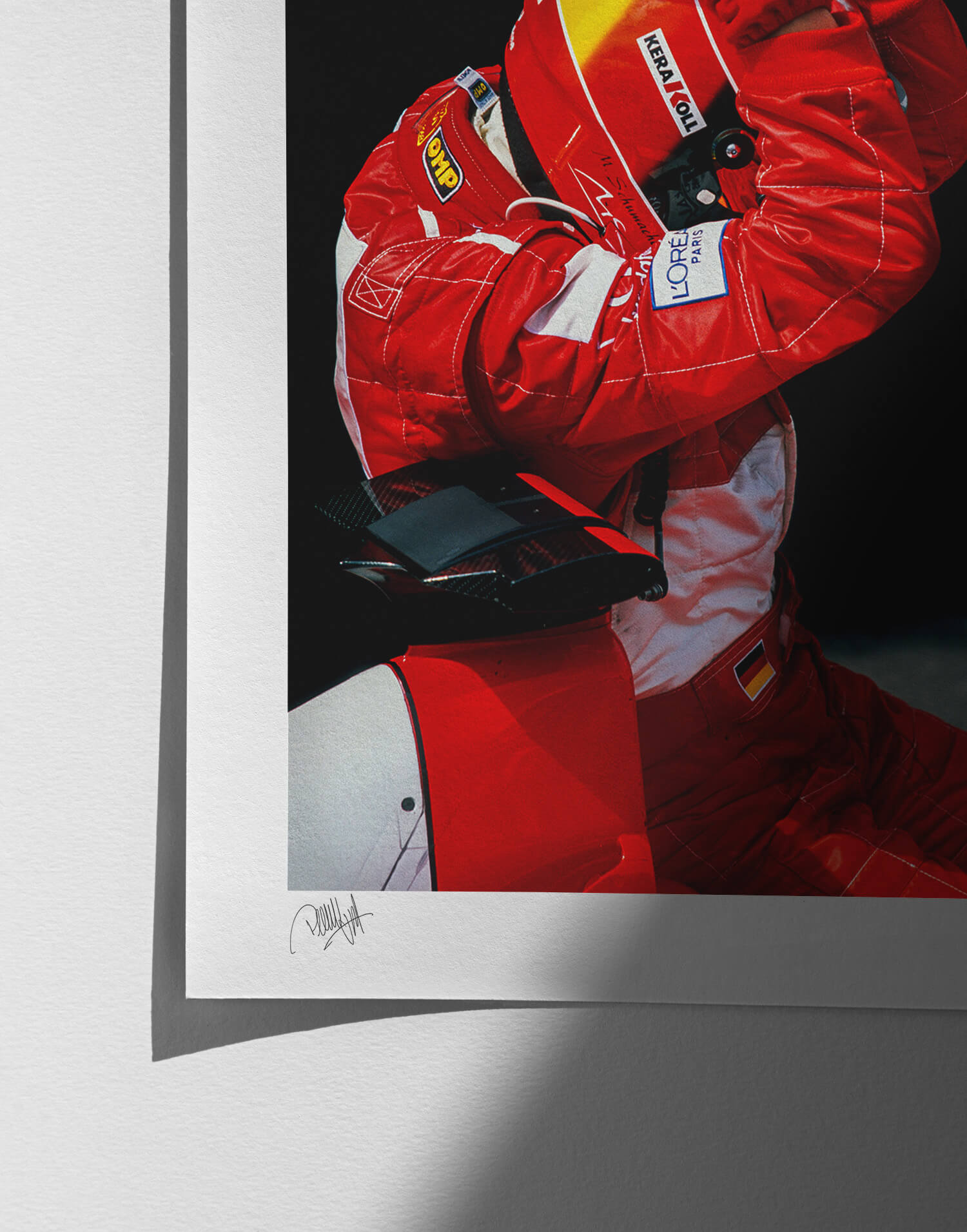 Michael Schumacher (Ferrari) celebrates in parc ferme after the 2002 French Grand Prix in Magny Cours. Framed photography print, produced in limited edition by WheelsOnWalls Gallery.