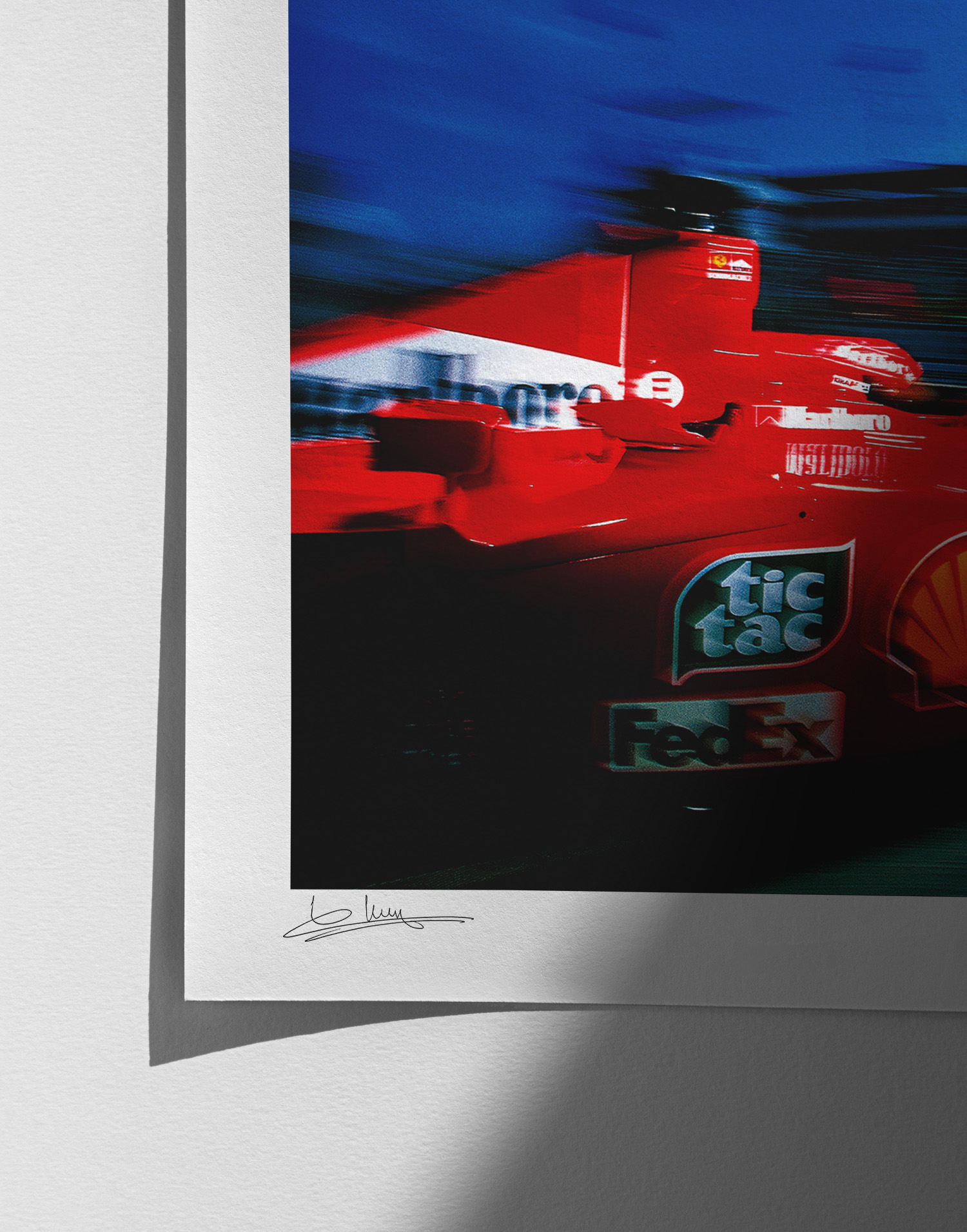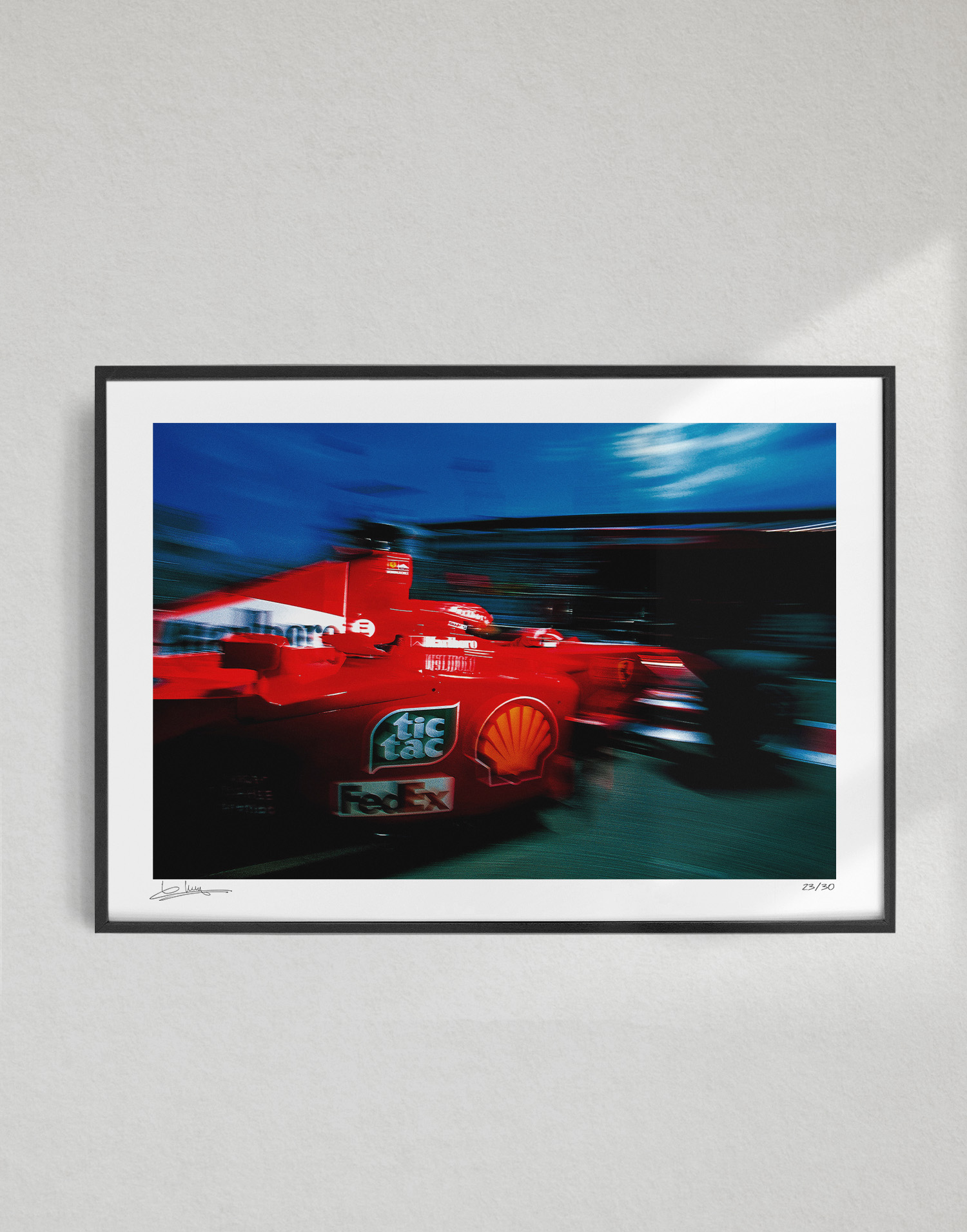 “Red Blur” by Dominique Leroy is a striking photography print that celebrates the golden age of Ferrari in Formula 1 and the incredible Michael Schumacher. With its impactful graphic style, this image captures Schumacher’s legendary Ferrari at the 2001 Austrian Grand Prix, adorned with the iconic logos of its partners. Instantly recognizable, it embodies the power and speed of the champion. This printed photograph is a true collector’s item, a must-have for die-hard fans of the German driver and the legendary Italian brand.