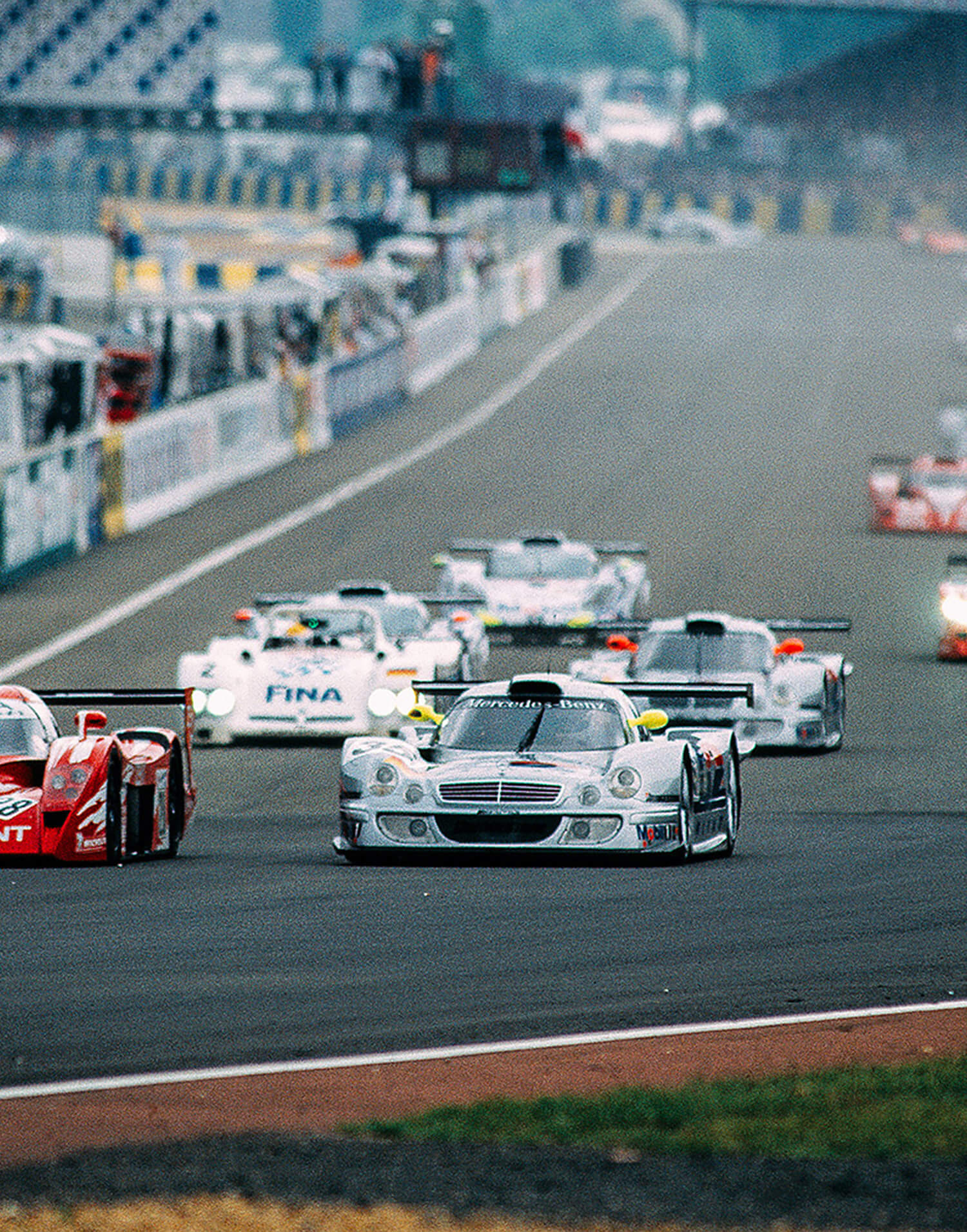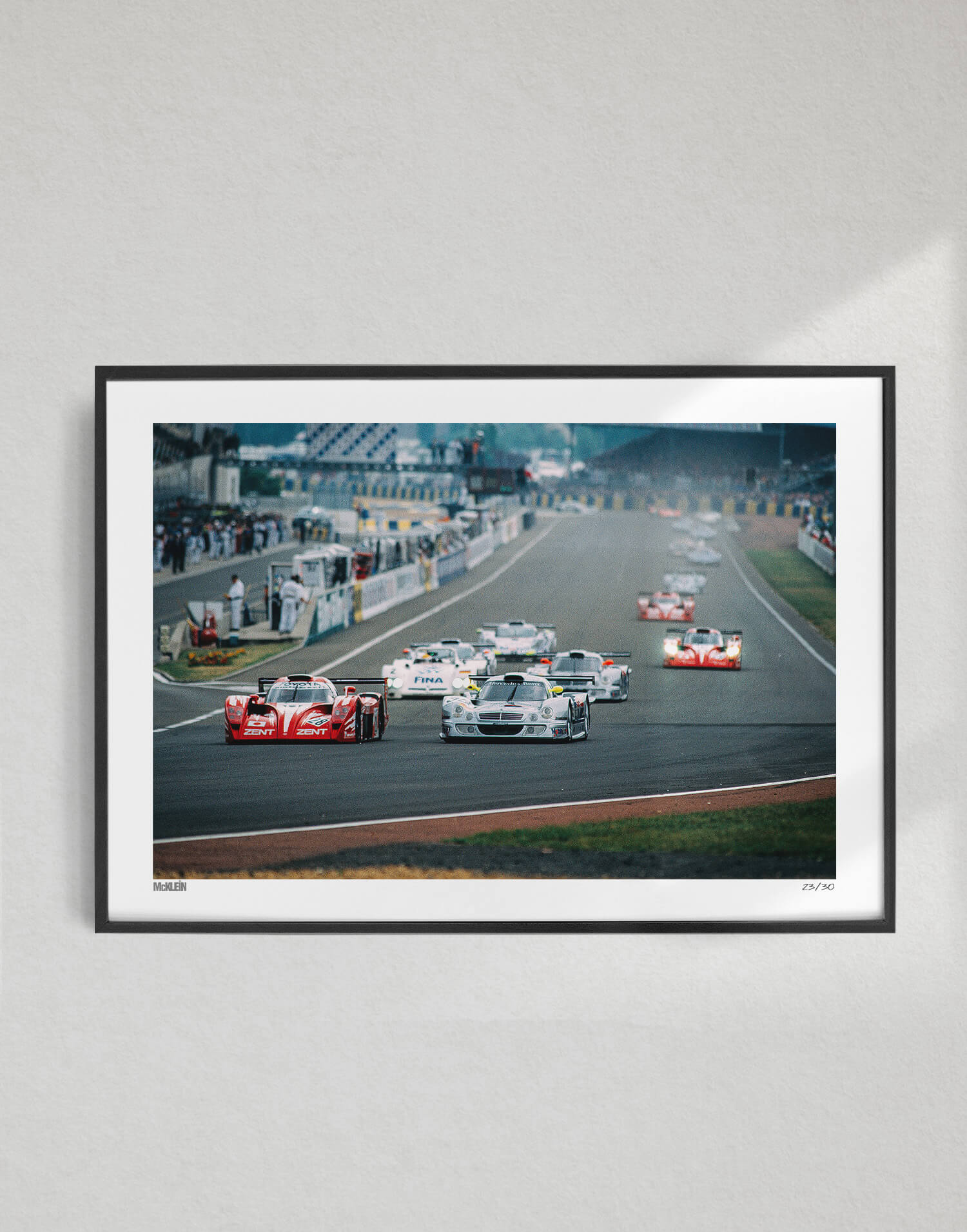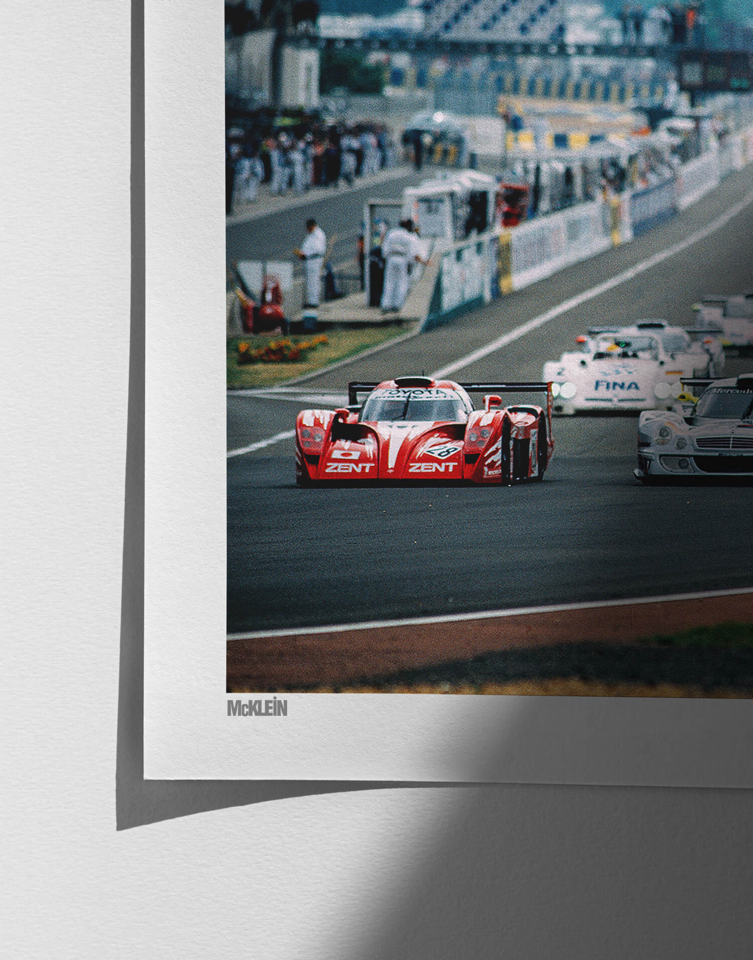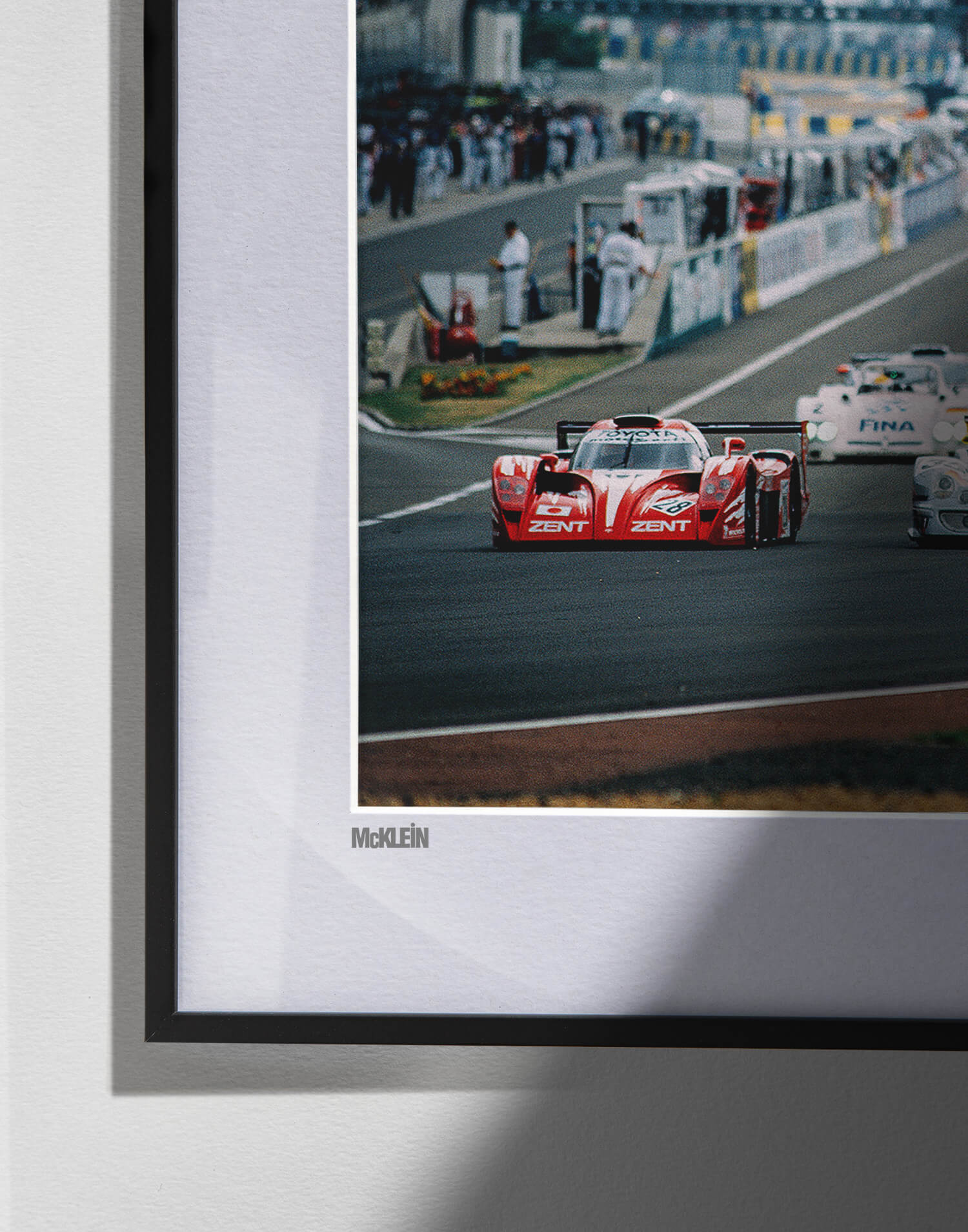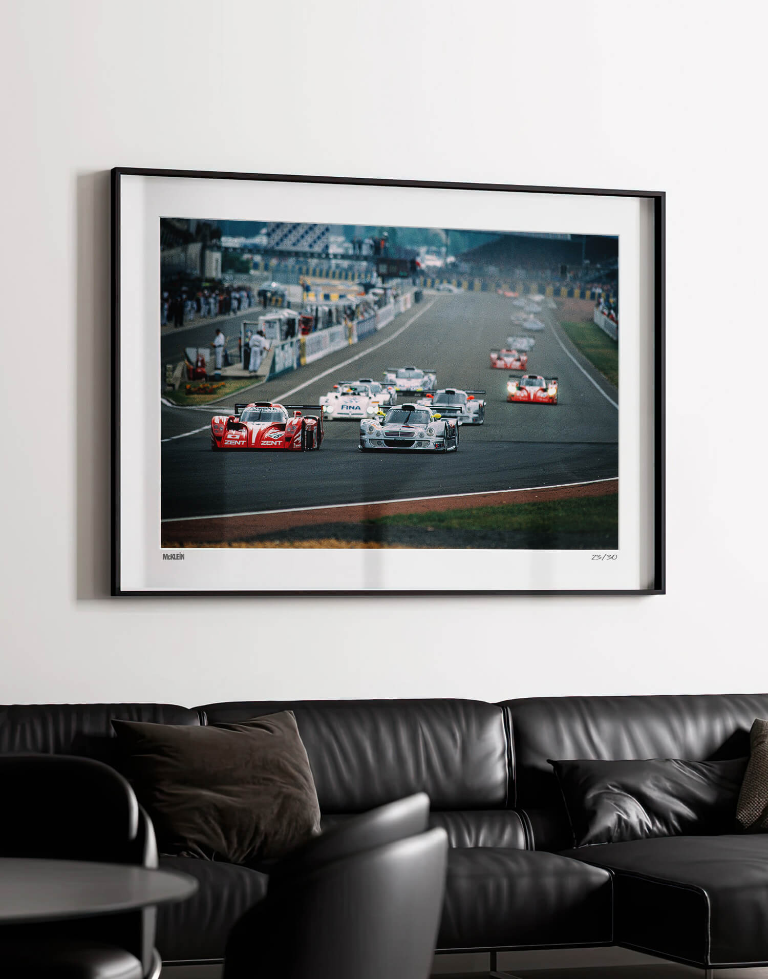 Start of the 1998 24 Hours of Le Mans, Toyota GT-One and Mercedes-Benz CLK-LM in action. Fine art photography print, produced in limited edition by WheelsOnWalls Gallery.