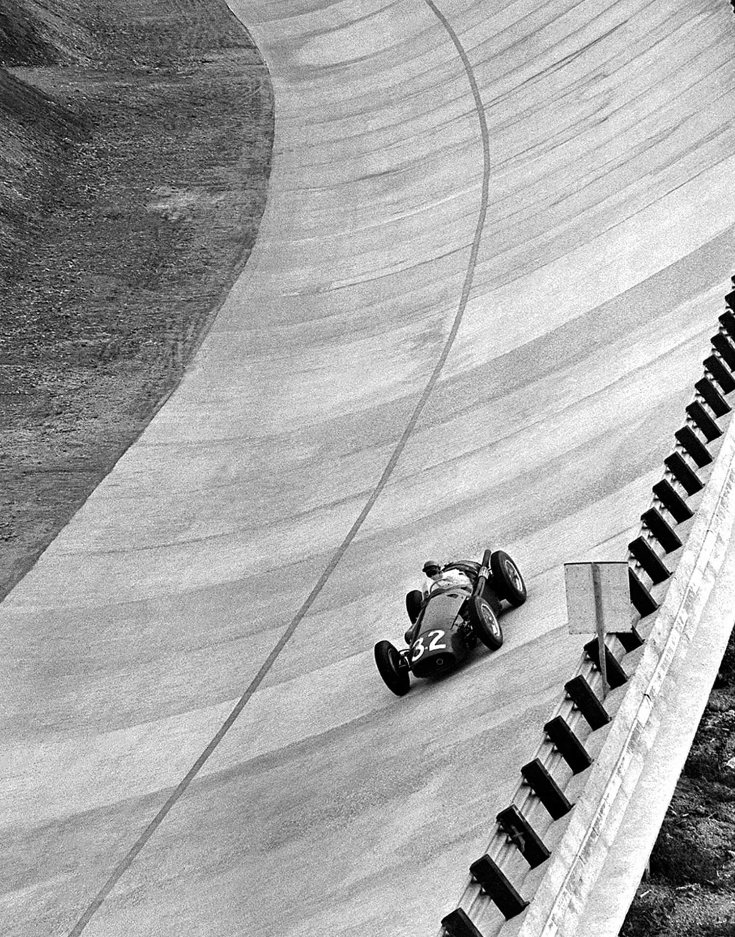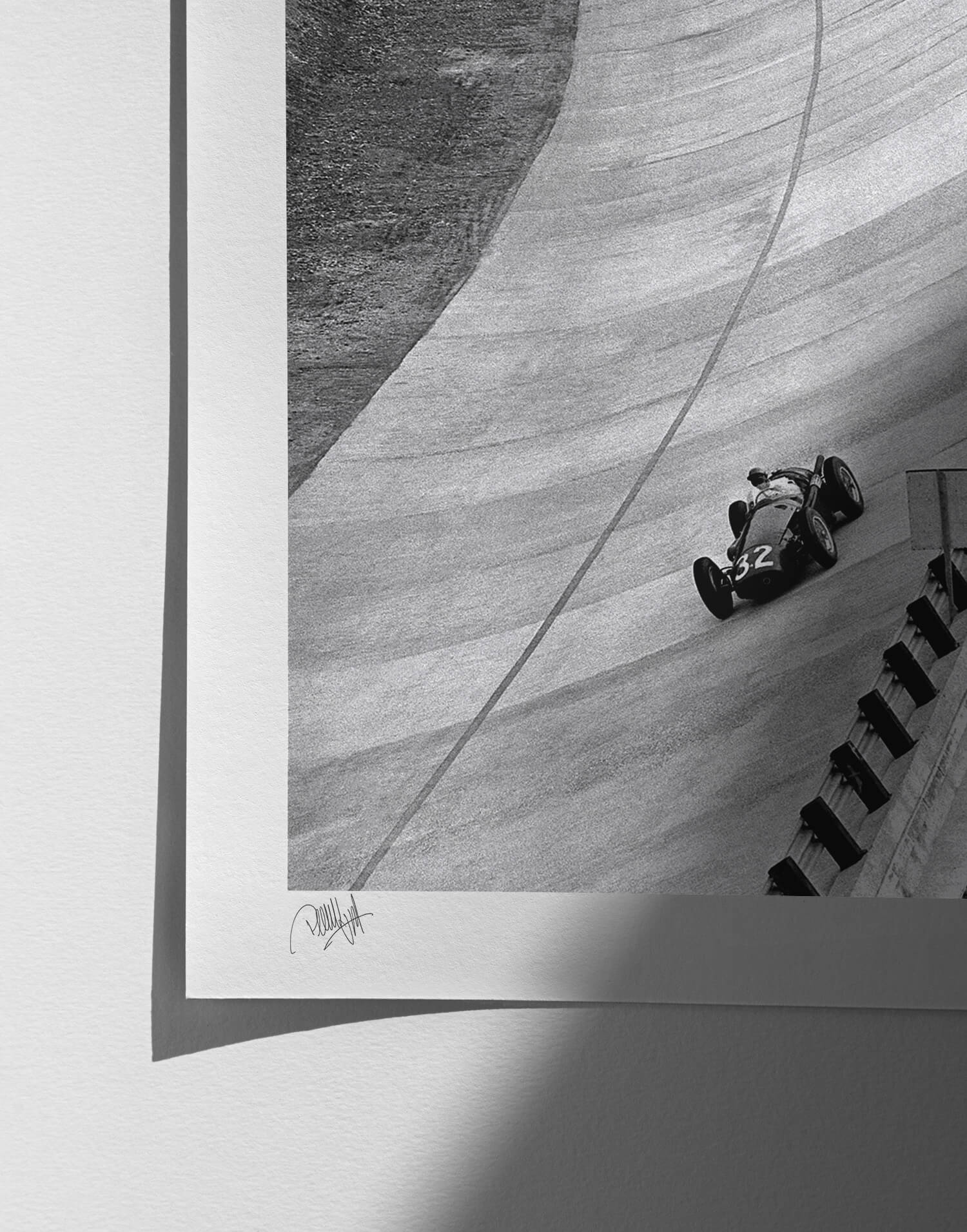 Peter Collins (Maserati) on the banking during the 1955 Italian Grand Prix at Monza. Framed photography print, produced in limited edition by WheelsOnWalls Gallery.