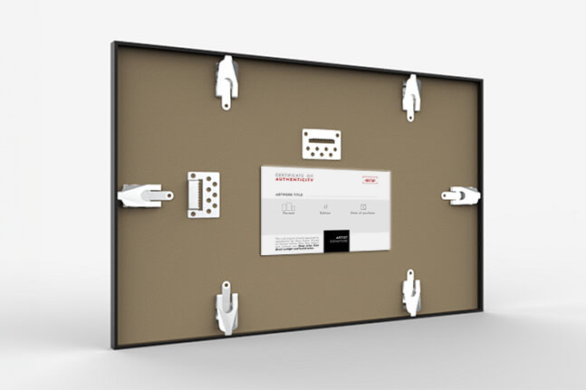 Jeder Rahmen ist mit dem notwendigen Aufhängematerial auf der Rückseite ausgestattet. Eine einzelne Schraube (nicht im Lieferumfang enthalten), die sicher an Ihrer Wand befestigt ist, reicht aus, um jeden unserer Rahmen mühelos aufzuhängen.