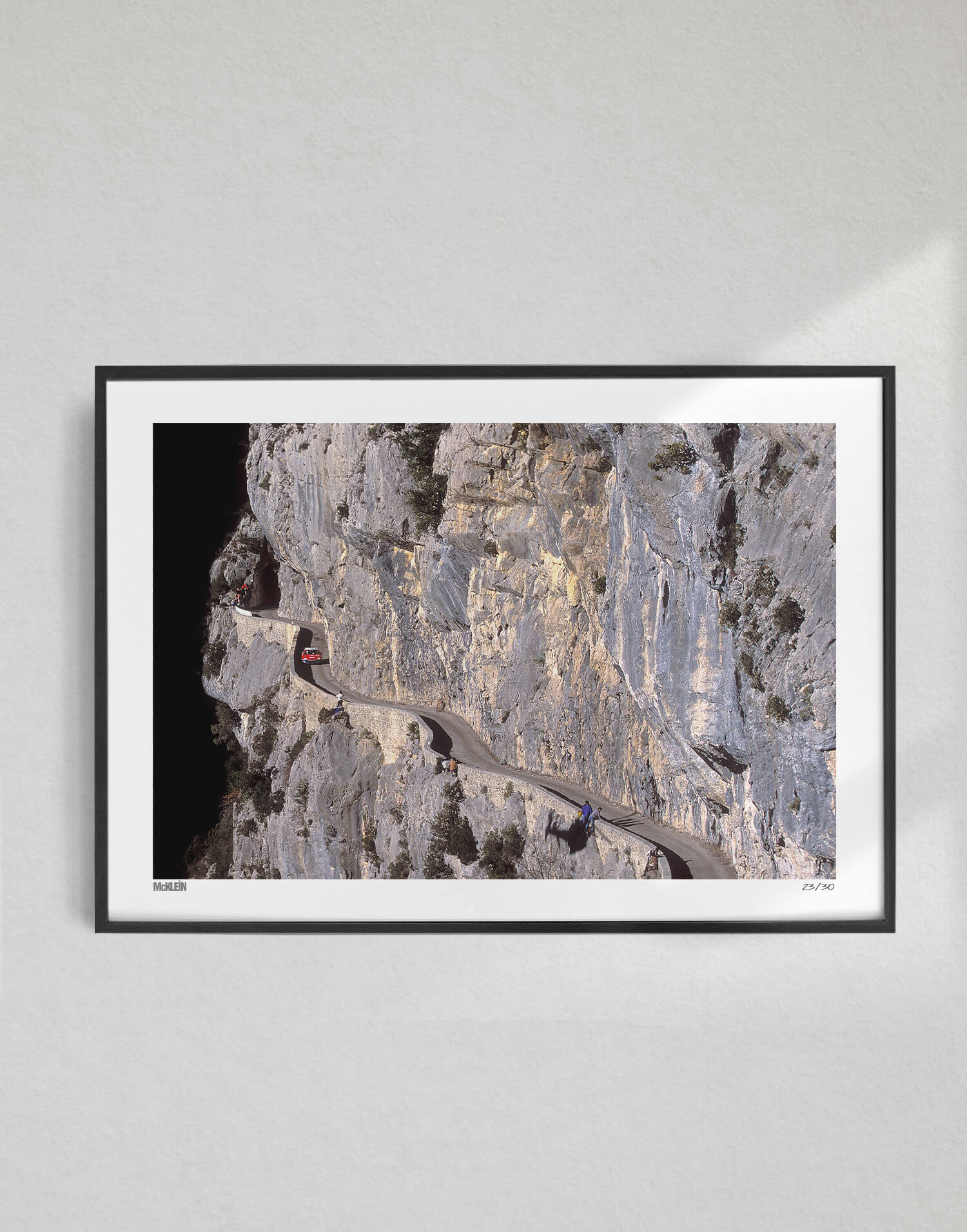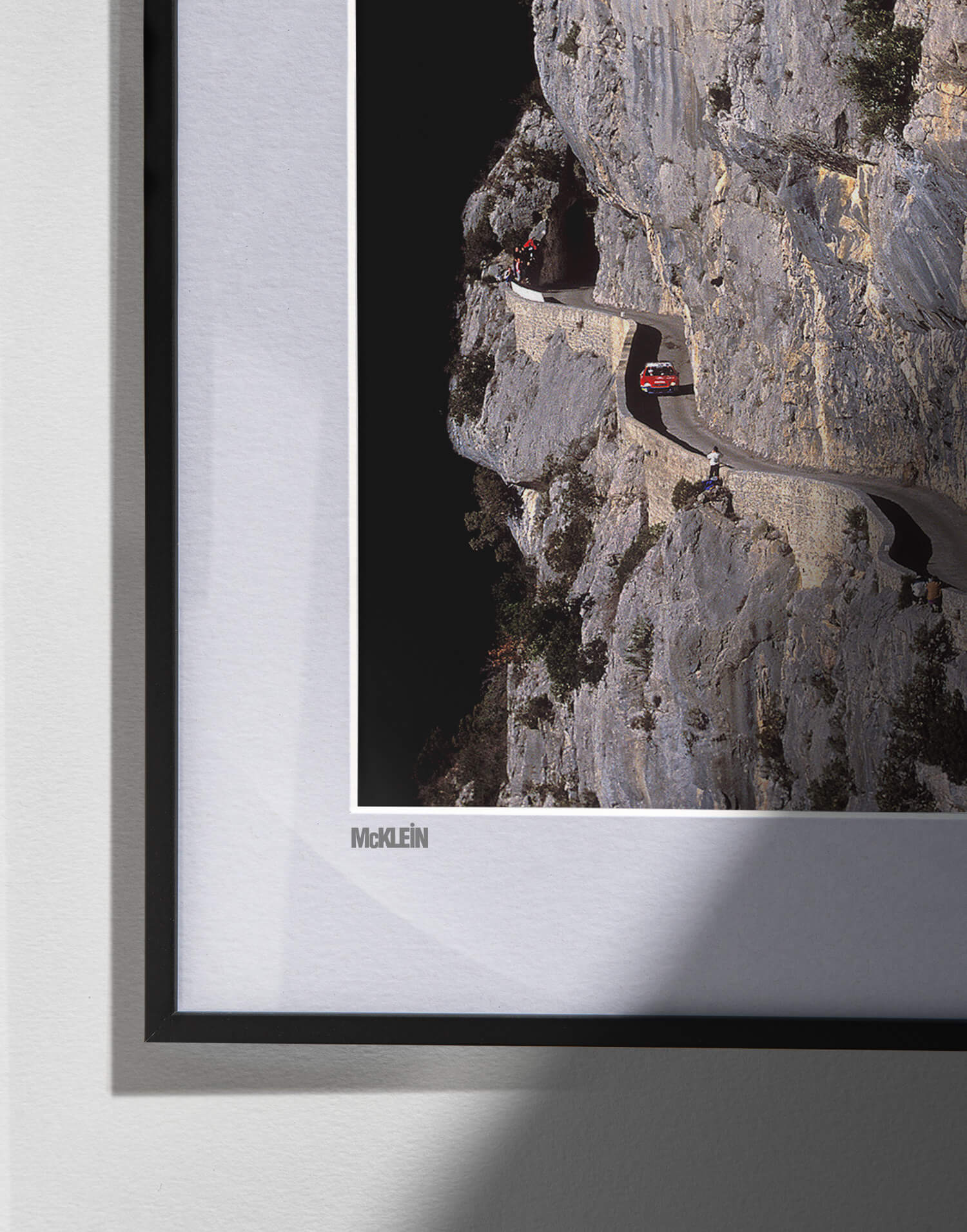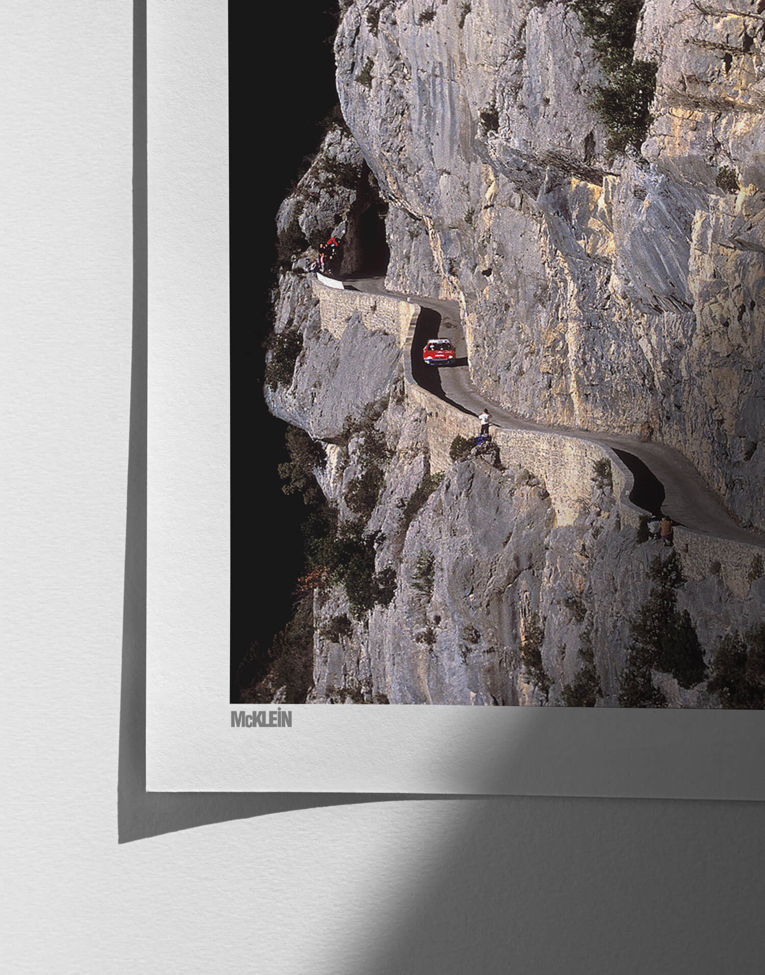 Después de una descalificación desgarradora que le arrebató su primera victoria en Montecarlo en 2002, Sébastien Loeb regresó más fuerte que nunca, logrando su primer triunfo oficial en 2003 en el legendario rally monegasco. Este momento histórico del automovilismo queda inmortalizado en esta obra de la colección McKlein, que captura al piloto francés recorriendo las curvas del Clue d’Aiglun en 2003.