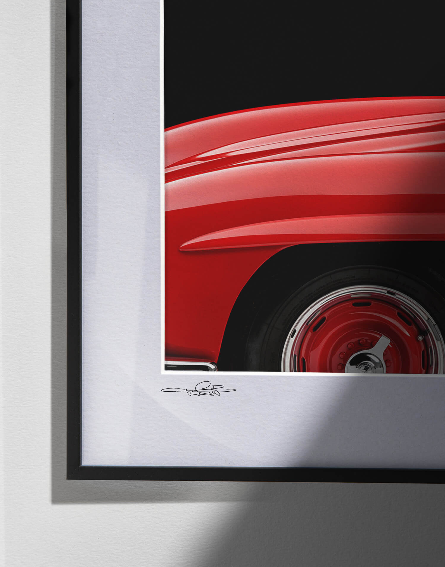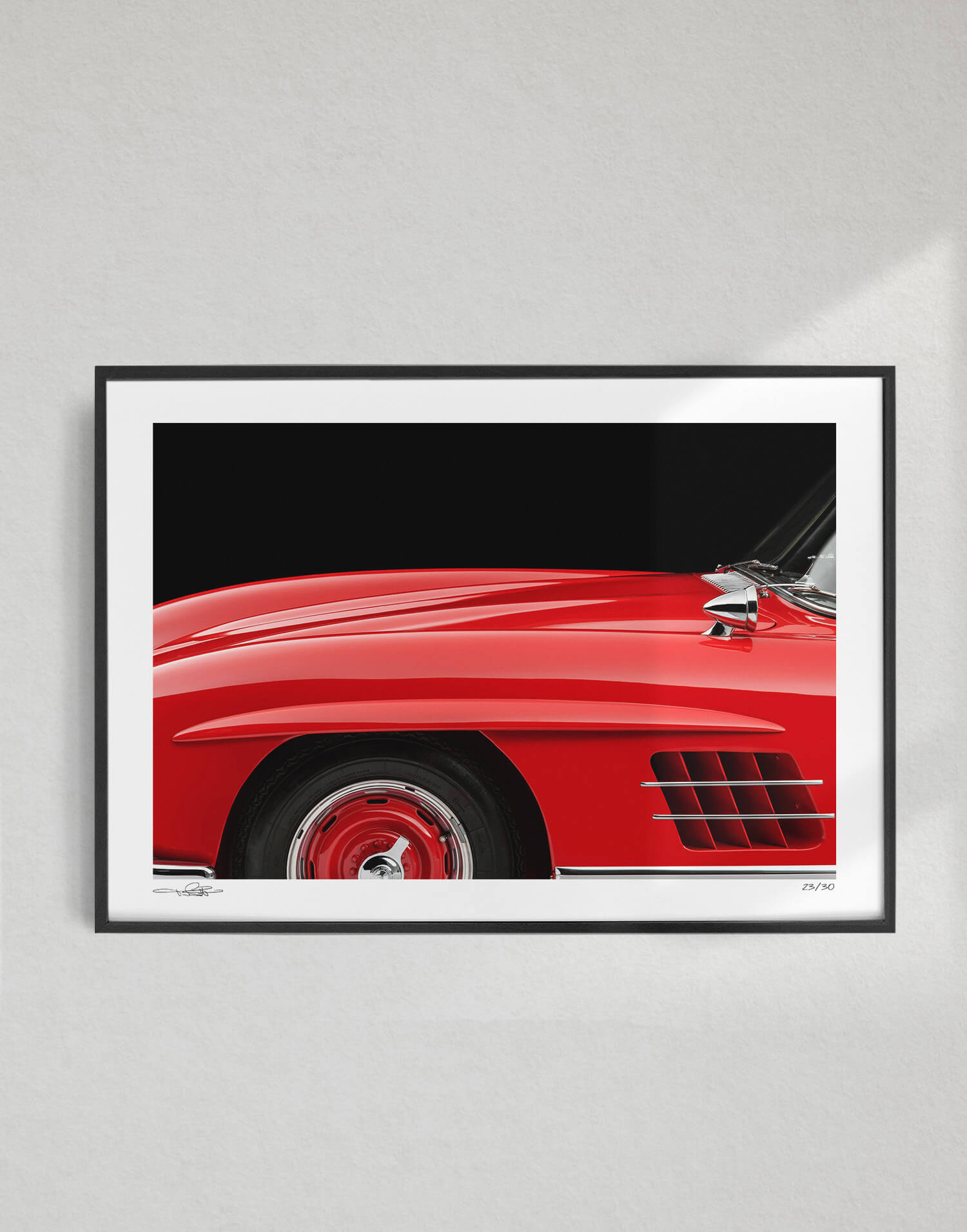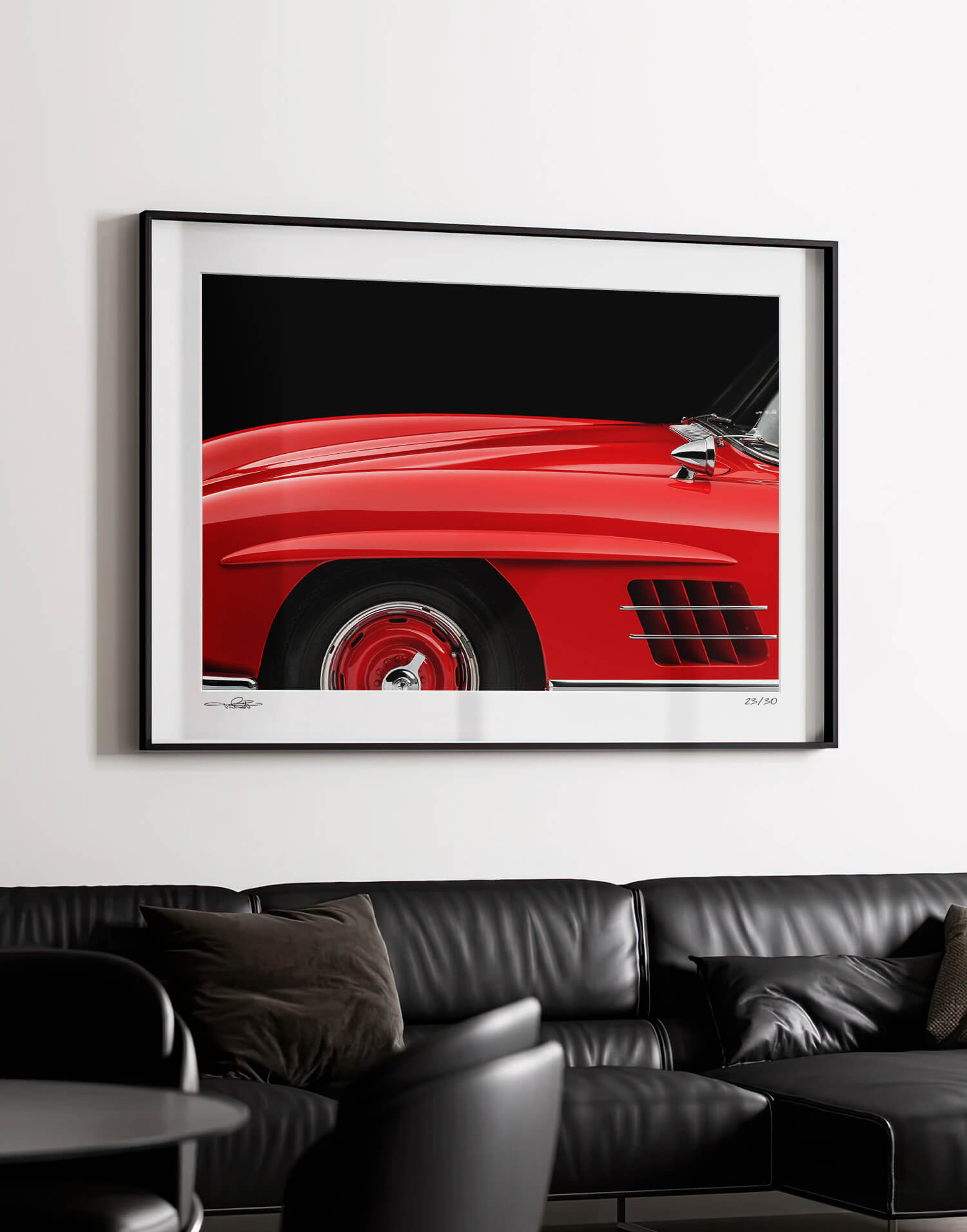 Fire Engine Red 300SL es una obra fotográfica con licencia, producida por WheelsOnWalls Gallery y disponible en edición limitada.