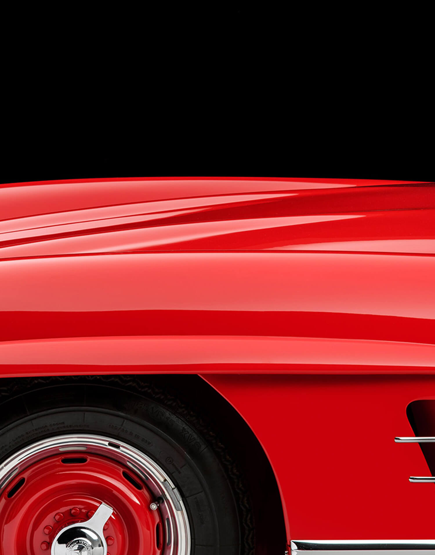 «Red 300SL» por Tim Scott. Esta detallada fotografía resalta a la perfección las líneas distintivas del Mercedes 300SL Gullwing en rojo, dando vida a una obra vibrante y atemporal.