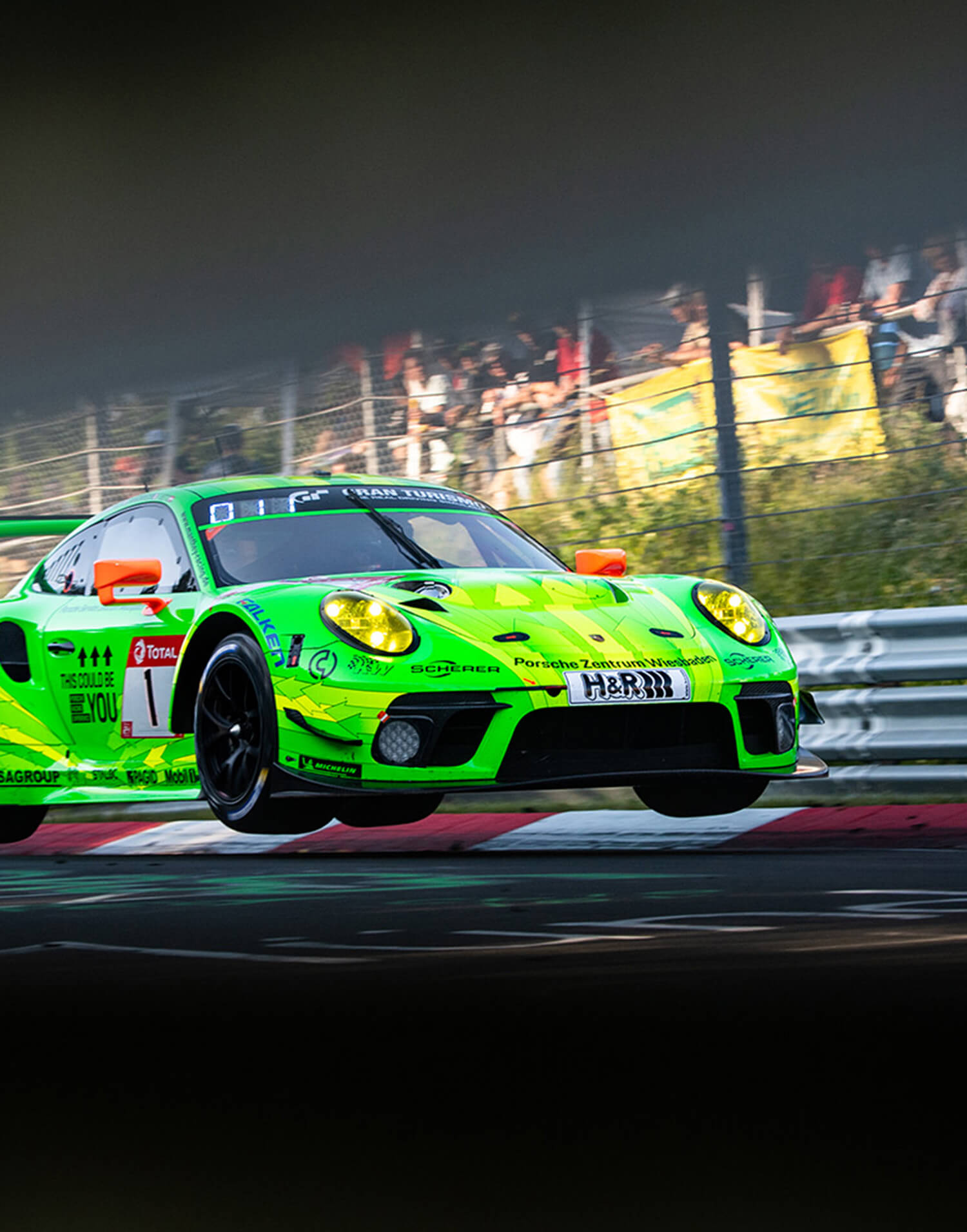 Impresionante fotografía del Porsche 911 de Manthey Racing ganador en las 24 Horas de Nürburgring 2019, volando sobre el circuito.