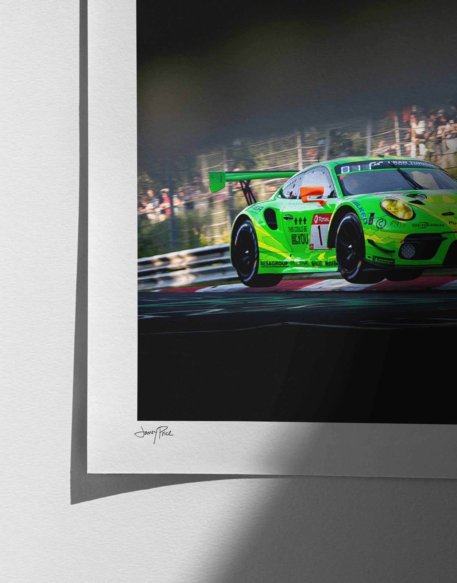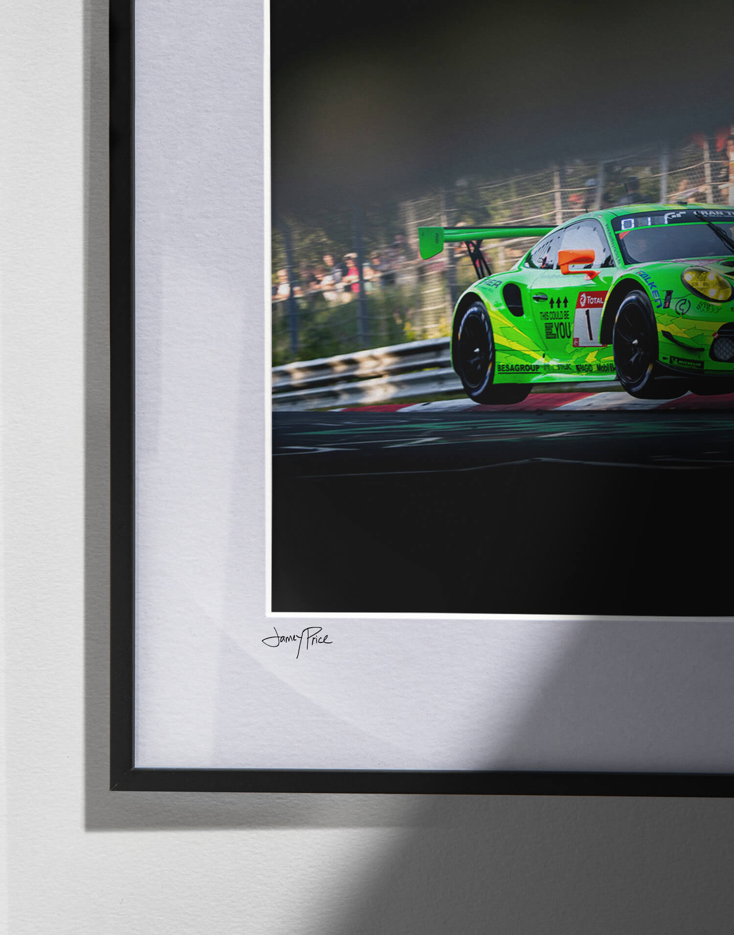 Flying Manthey – Nürburgring 24 Hours es una obra fotográfica con licencia, producida por WheelsOnWalls Gallery y disponible en edición limitada.