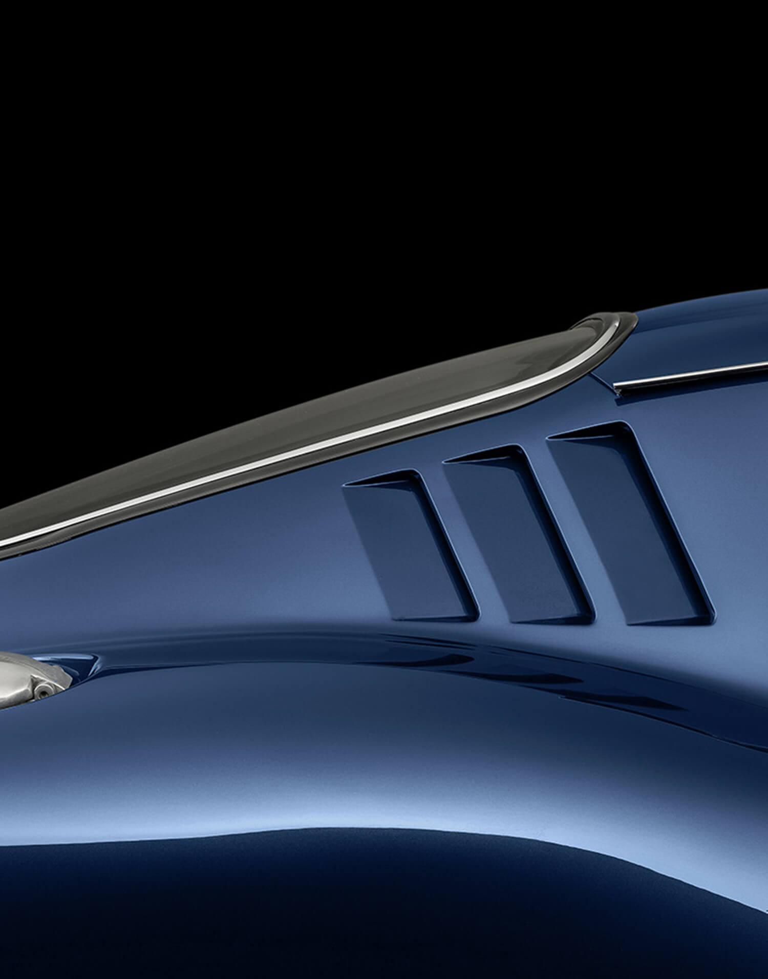 «Blue 275 GTB» por Tim Scott. Detalle exquisito y evocador del Ferrari 275 GTB de 1966 en un impactante color azul, sobre un fondo negro.