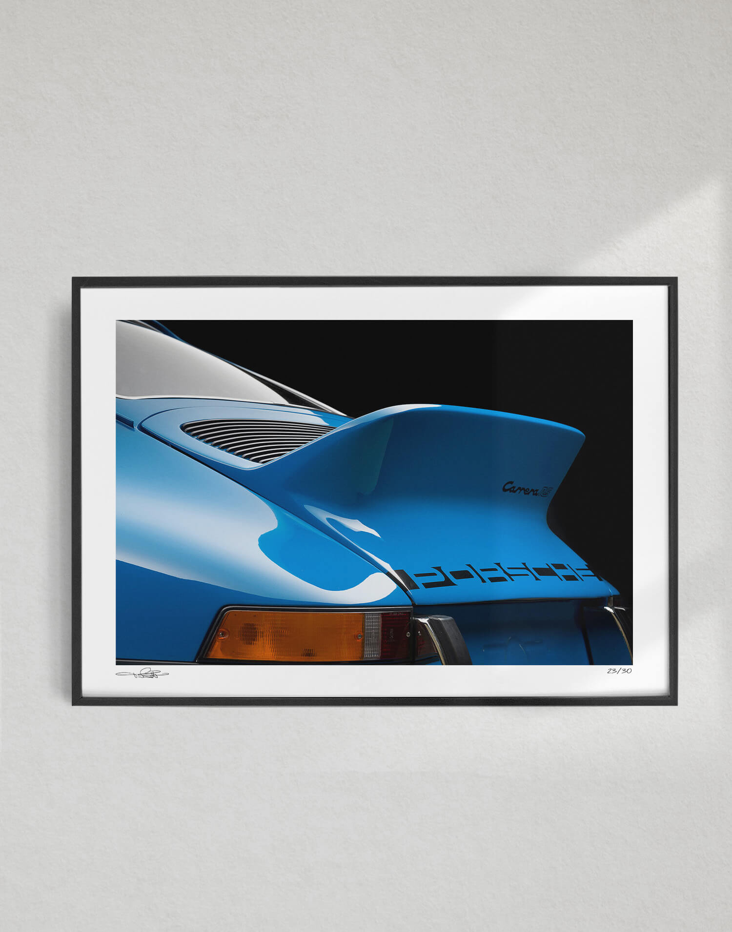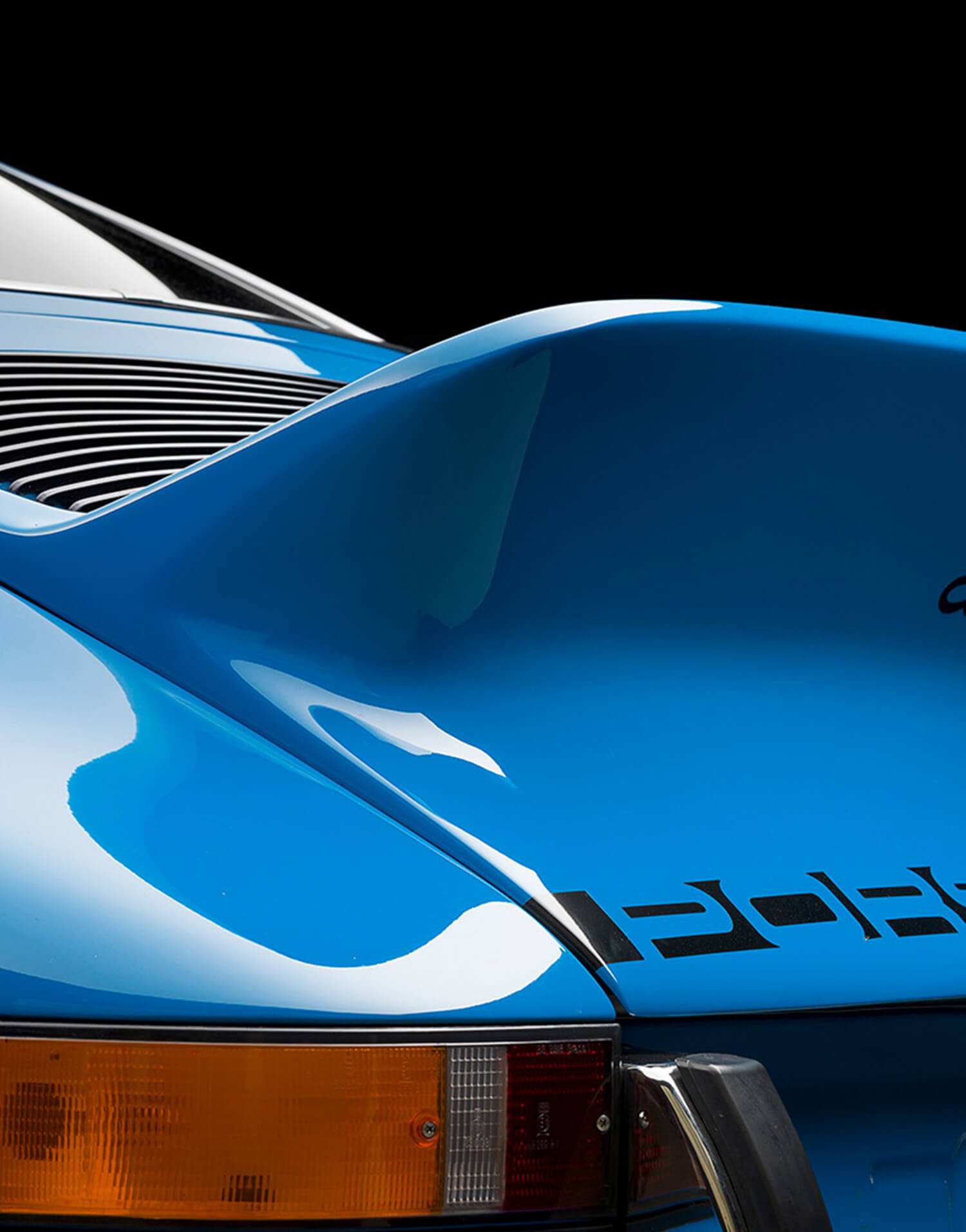 «Glacier Blue 911 RS» por Tim Scott. Impresionante detalle fotográfico del icónico «duck tail» del Porsche 911 2.7 RS de 1973, presentado en el exclusivo color Glacier Blue.