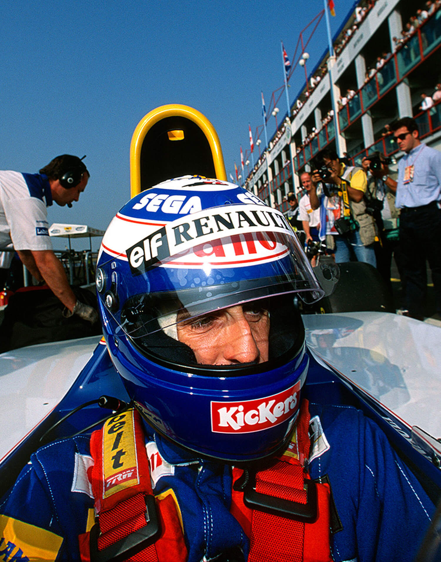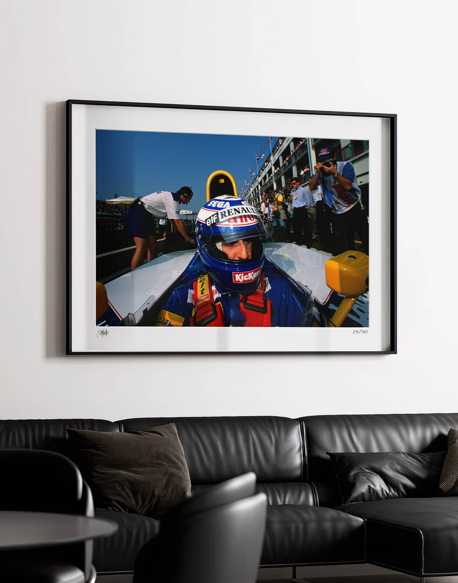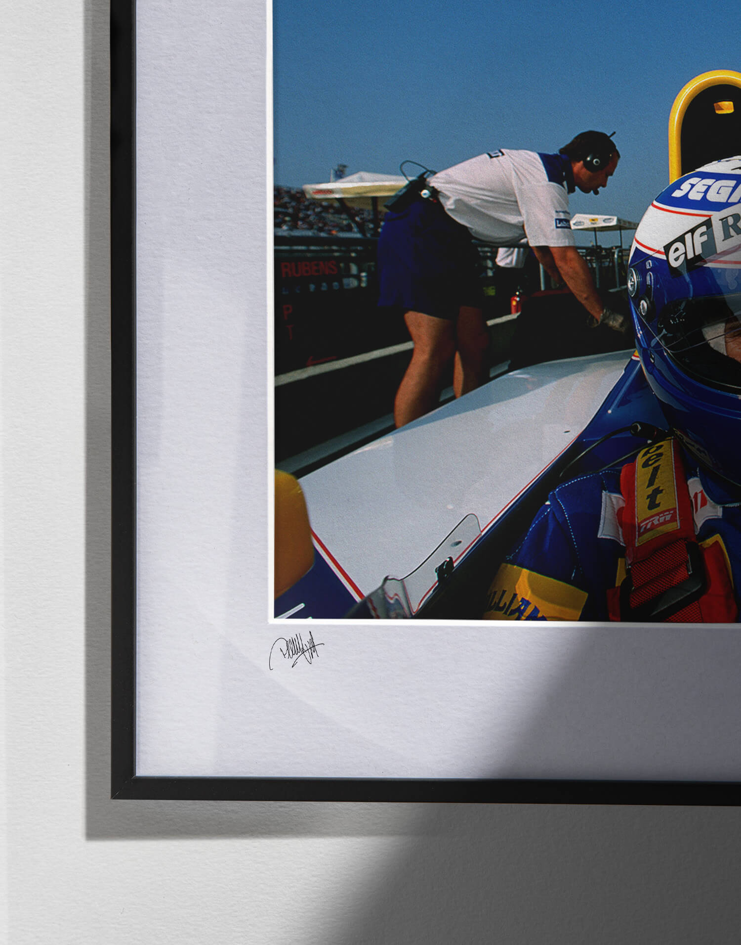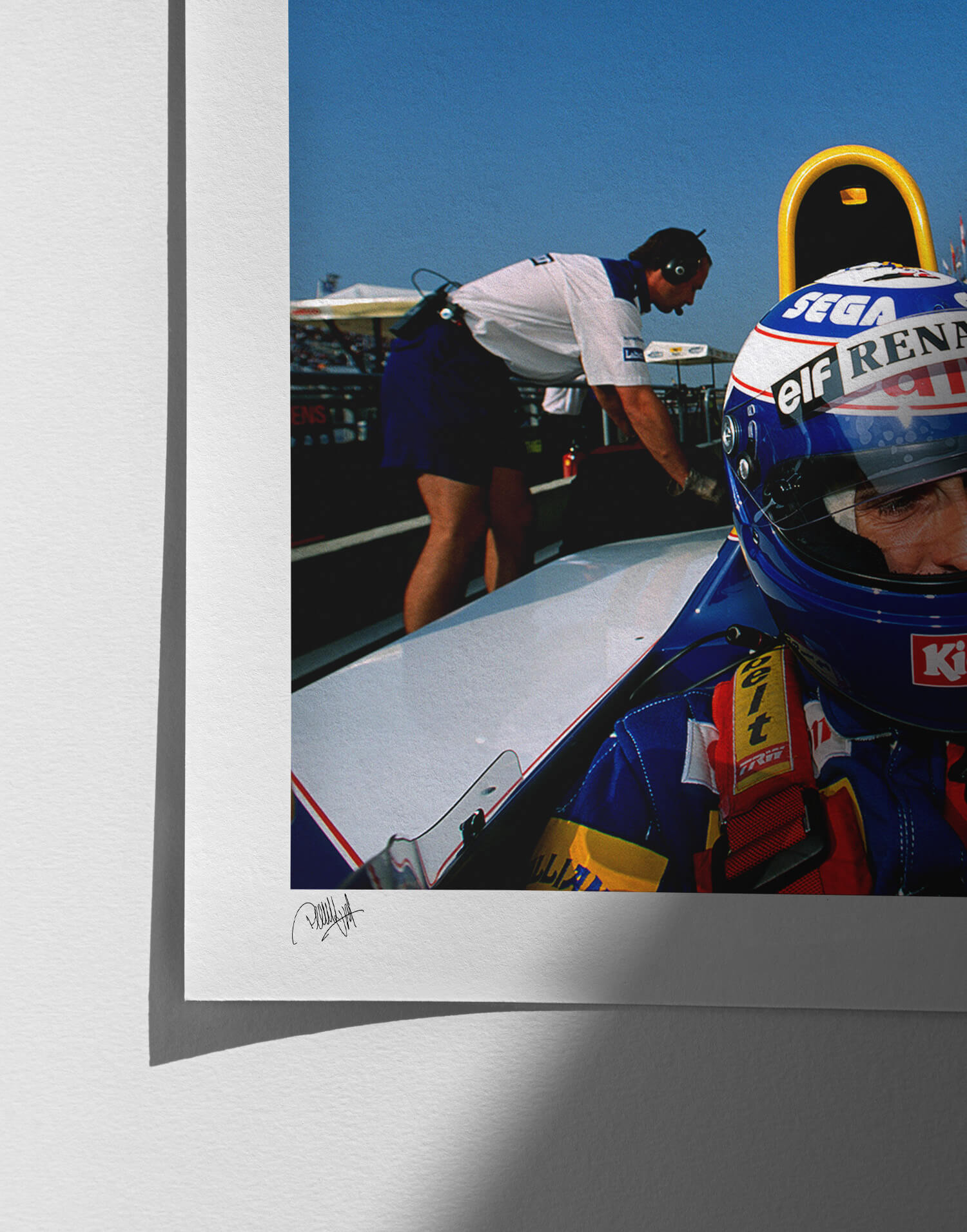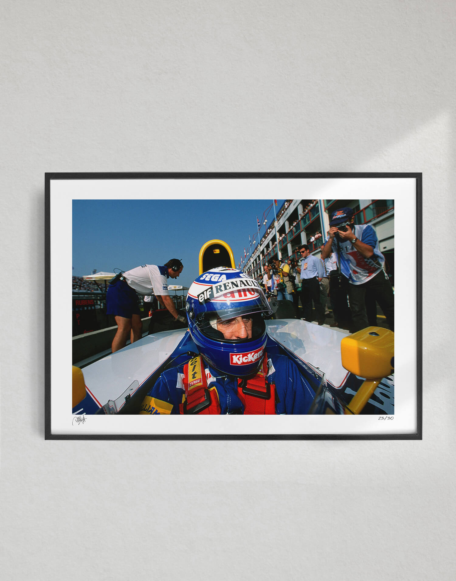 Alain Prost (Williams-Renault) con il casco indossato prima del Gran Premio di Francia 1993 a Magny-Cours. Stampa fotografica incorniciata, prodotta in edizione limitata da WheelsOnWalls Gallery.
